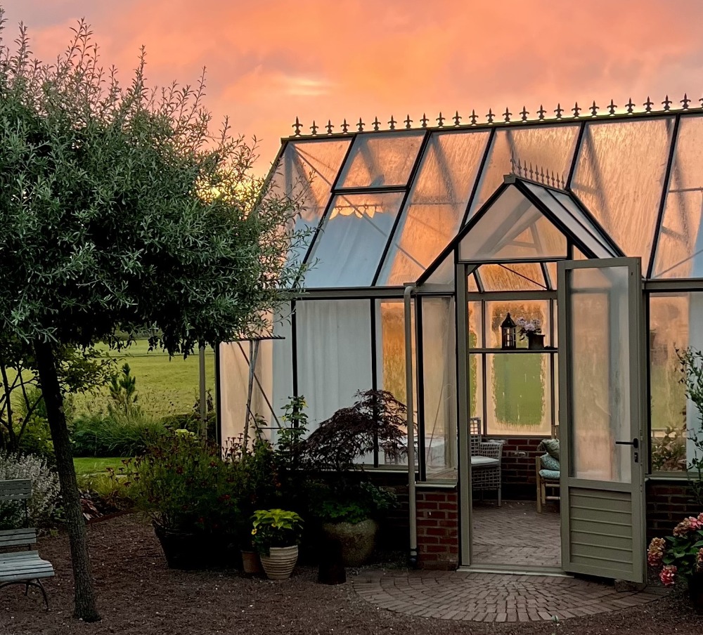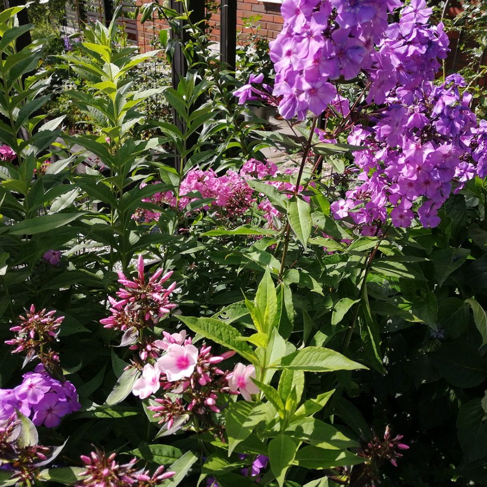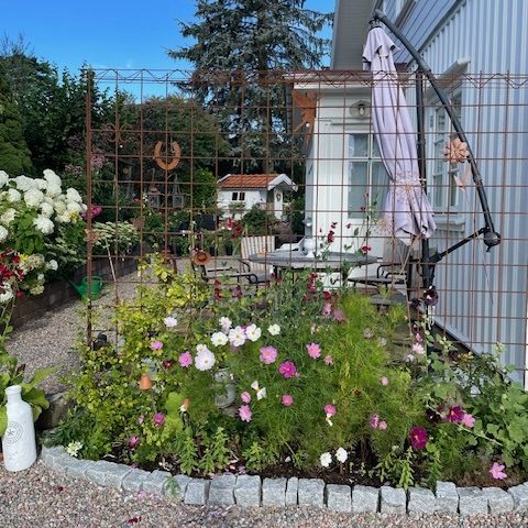 Mitt intresse för att odla väcktes till liv när vi flyttade hit och succesivt har vi tillsammans byggt upp trädgården som den ser ut idag. Jag sår sommarblommor, perenner och en del grönsaker. Under de senare åren har jag satsat på att odla och plantera mestadels perenner och mindre buskar. Vi har rosor, klematis, hortensior och dahlior. I trädgården har vi ett mindre växthus. Jag odlar mest i pallkragar och upphöjda rabatter. Lasse tar hand om fruktträden och gräsmattan. Han står även för design, bygger lådor att odla i, lägger sten och murar.