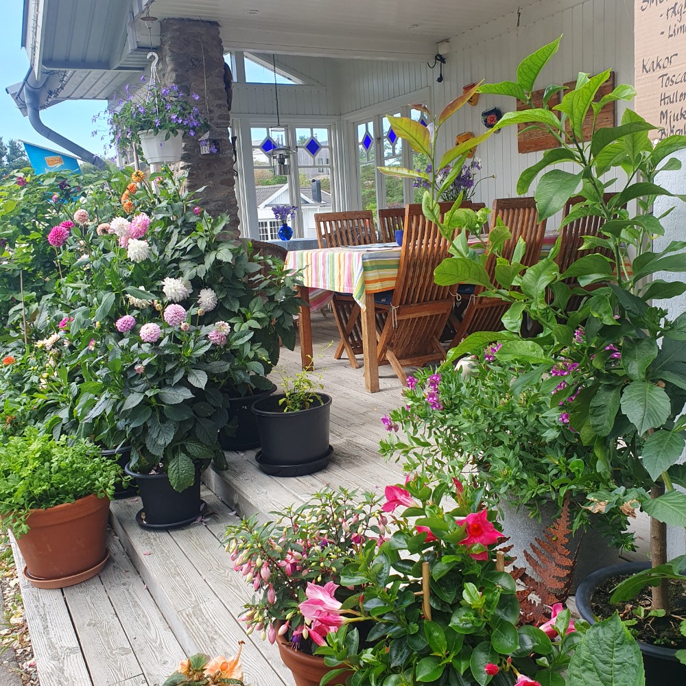 Trädgården är ca 600 kvm och består mestadels av berg, altaner och rabatter. Det har varit en utmaning att dels utveckla med nya växter med det vi redan har. Att ta vara på ytor som kan göras om och nyskapas är det vi tycker är så härligt. Utöver rabatter kompletterar vi med många krukor fyllda med ögonfröjd.