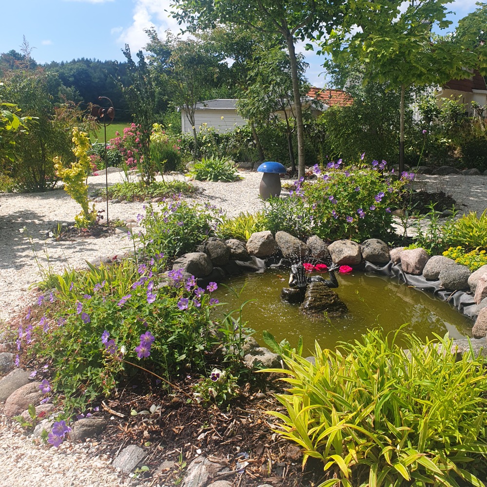 Trädgården är indelad i olika rum. Här finns en liten damm, Italieninspirerad bakgård, en framsida med känsla av engelsk trädgård, en plommonlund (ej klar), bersåer och altaner.