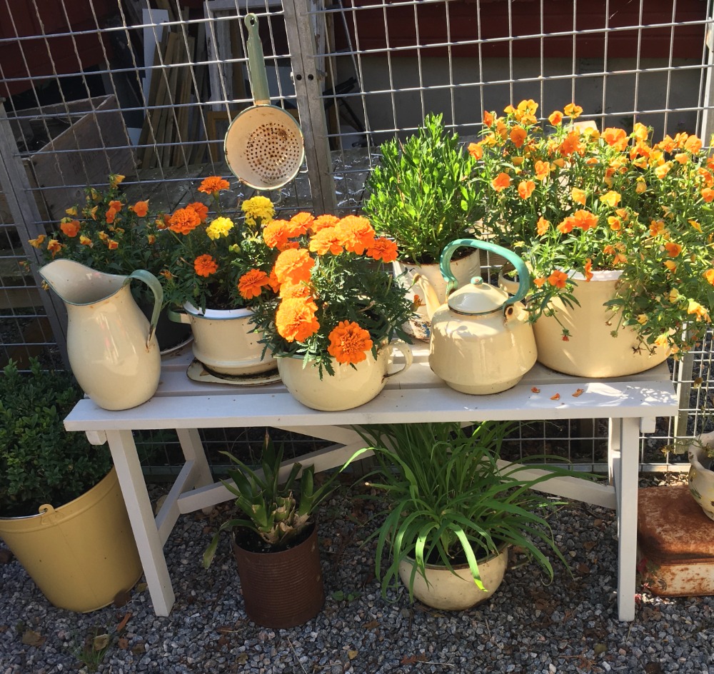 I krukorna har vi fyllt på med pelargoner av en mängd olika sorter. Det är gamla plantor, sticklingar vi tagit och några nyinköpta varje år. I skrivande stund vilar de nu i växthuset.